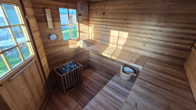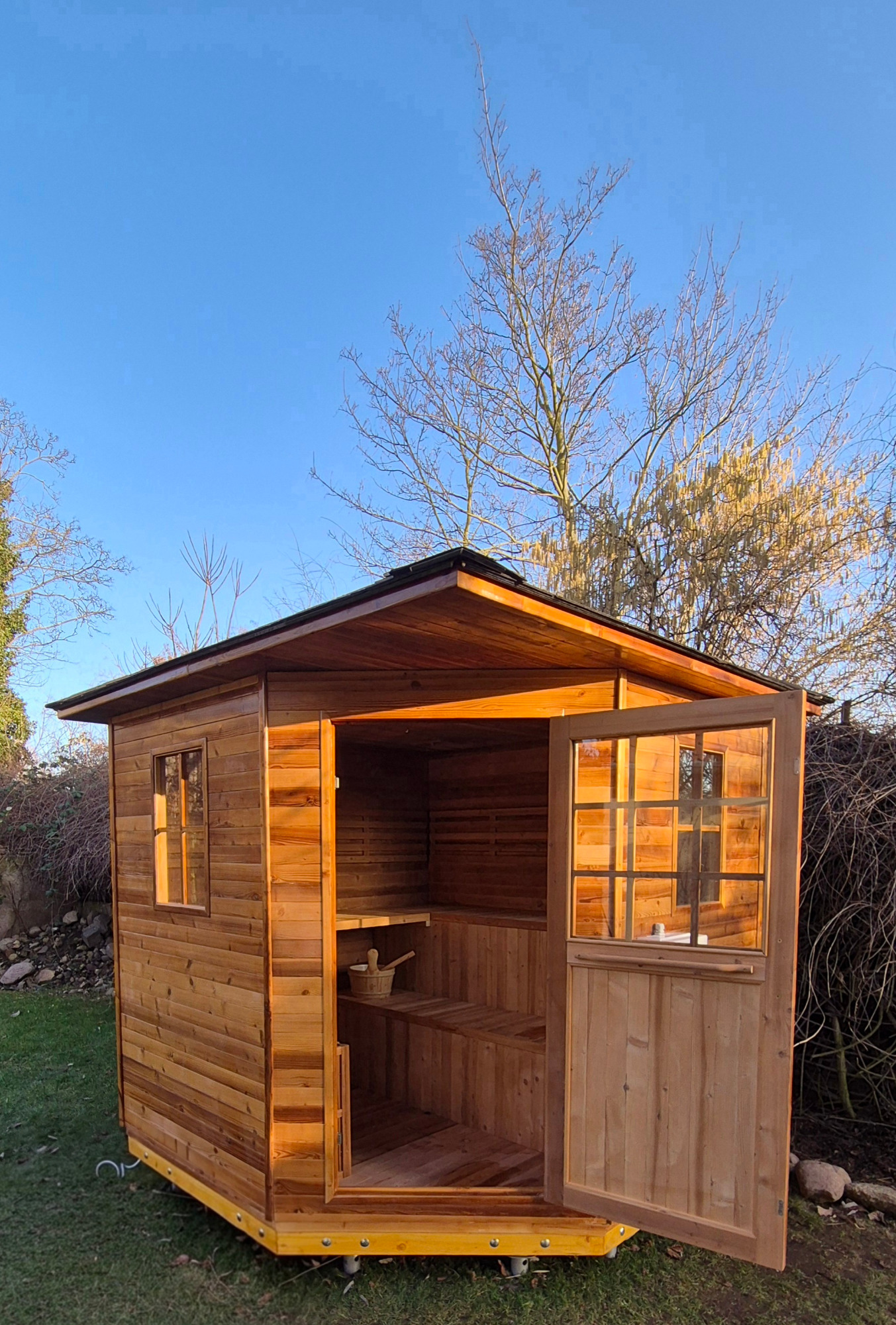 Seit März 2026 können Sie auch eine Garten-Sauna nutzen. Saunatücher und Bademäntel erhalten Sie gern auf Anfrage.